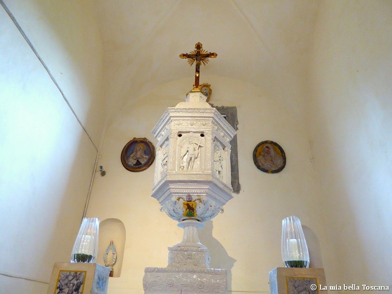 Dietro l’altare in alto spicca un’altro capolavoro dei Della Robbia:
